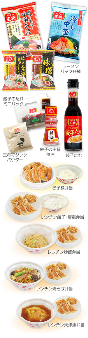 | ラーメンパック 餃子の王将ラーメン(1食入) 味噌ラーメン(1食入) 冷し中華(1食入・期間限定) ※北海道の店舗では取り扱っておりません。 |